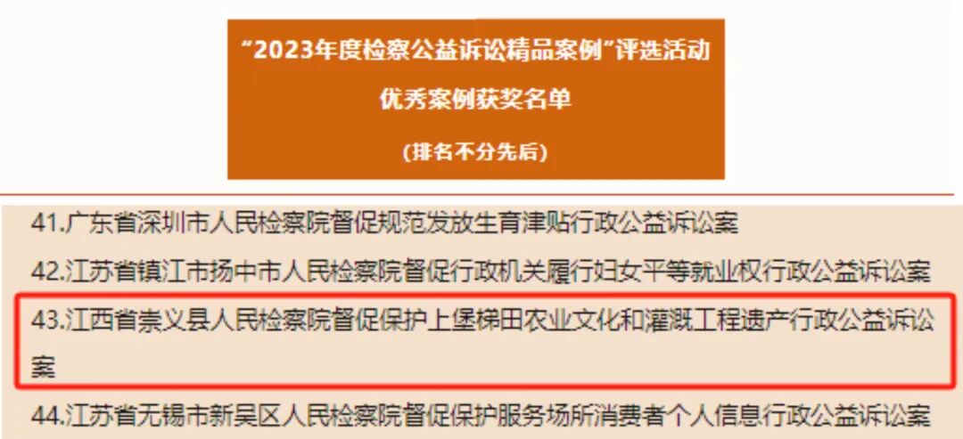2024年9月7日-9月8日,中国法学会行政法学研究会、法治政府研究院、中国政法大学检察公益诉讼研究基地主办,西北政法大学检察公益诉讼研究中心、郑州大学检察公益诉讼研究院、湘潭大学公益诉讼检察理论研究中心、华东政法大学上海公益诉讼研究中心协办“2023年度检察公益诉讼精品案例”,其中崇义县人民检察院督促保护上堡梯田农业文化和灌溉工程遗产行政公益诉讼案入选“2023年度检察公益诉讼精品案例”评选优秀案例。
