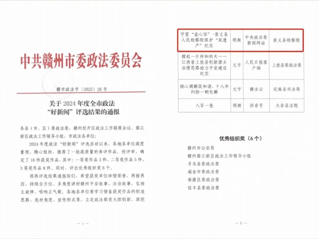 崇义县人民检察院报送的《守望“益⼼田”-崇义县⼈民检察院保护“ 双遗产 ”纪实》获2024年度全市政法“好新闻”三等奖!
