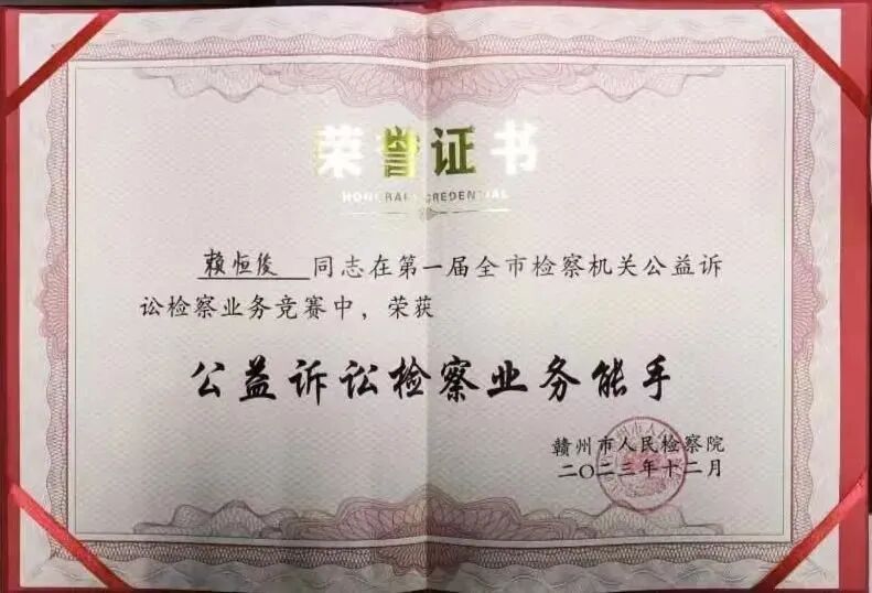 12月15日,崇义县人民检察院第二检察部副主任赖恒俊同志荣获“第一届全市检察机关公益诉讼检察业务能手”称号。