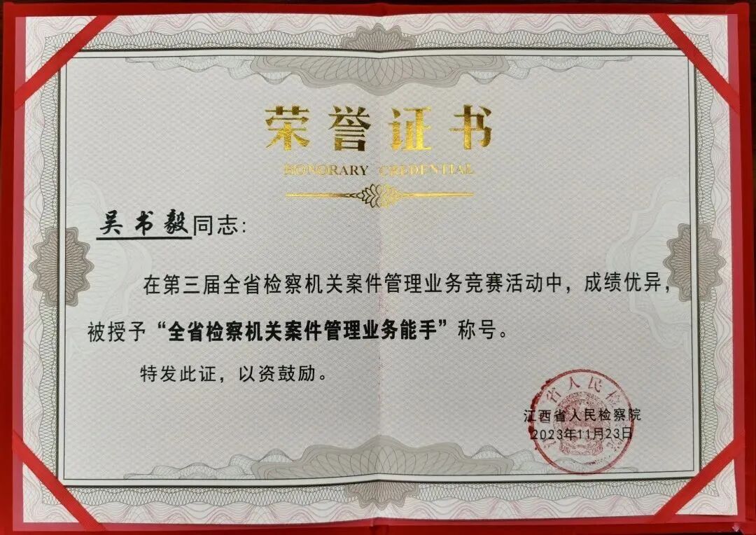 11月23日,崇义县人民检察院第三检察部副主任吴书毅同志荣获“全省检察机关案件管理业务能手”称号。