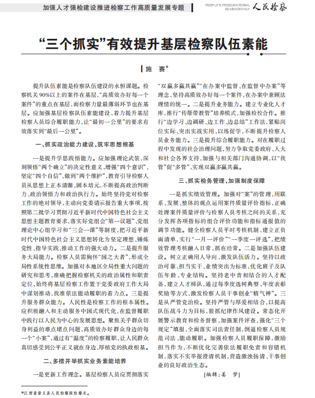 12月25日,《人民检察》刊发崇义县人民检察院党组书记、检察长施赛的署名文章《“三个抓实”有效提升基层检察队伍素能》。